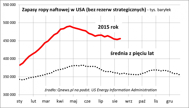 Notowania ropy naftowej w USA osunęły się już poniżej dołków z początku roku. Jednym z impulsów okazały się najnowsze dane na temat stanu zapasów tego surowca - okazało się, że w ciągu tygodnia powiększyły się o 2,6 mln baryłek. To przyrost największy od 17 tygodni, a przecież trwa sezon zwiększonego zużycia paliw, w którym historycznie zapasy z reguły maleją. Jednocześnie jak pokazuje poniższy wykres, zapasy utrzymują się na poziomach zdecydowanie wyższych niż w poprzednich latach.