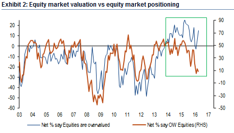 Sondaż BofA/ML: odsetek netto zarządzających uważających, że akcje są przewartościowane (linia niebieska) oraz odsetek netto zarządzających deklarujących ponadnormatywny udział akcji w portfelach
