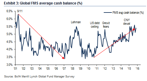 Jednocześnie wyniki sondażu sugerują, że zarządzający na świecie stali się - prawdopodobnie pod wpływem ubiegłorocznych rozczarowań - dużo ostrożniejsi, niż było to historycznie. Jeśli akcje faktycznie są tak przewartościowane, to według historycznych wzorców zarządzający powinni być w euforii. Tymczasem wysoki udział gotówki w portfelach ich funduszy świadczy o czymś zupełnie innym - historycznie była to paradoksalnie okazja do kupowania, a nie do sprzedawania akcji.