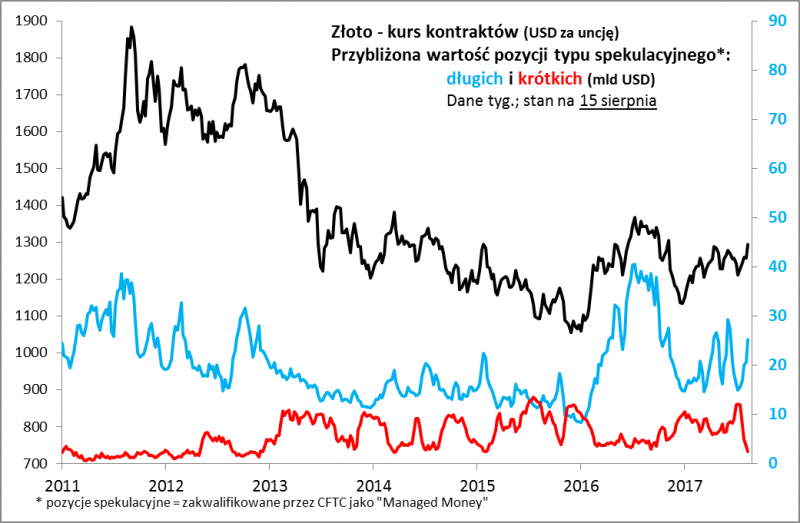 Tradycyjnie rzućmy okiem na dane komisji CFTC nt. wielkości pozycji spekulacyjnych na rynku kontraktów na złoto. Okazuje się, że lipcowo-sierpniowy wzrost notowań napędzany był przez paniczne zamykanie przez traderów (głównie duże fundusze hedgingowe) krótkich pozycji. Innymi słowy, o ile jeszcze w połowie lipca traderzy stawiali niemal rekordowe pieniądze na scenariusz spadku cen szlachetnego metalu, to ostatnio prawie całkowicie wycofali się z tych zakładów, jednocześnie przerzucając pieniądze na długie pozycje.