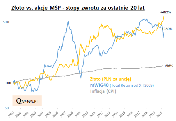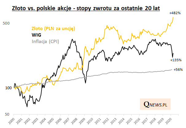 W ramach najnowszej "rundy" na przestrzeni ostatnich kilkunastu miesięcy złoto dosłownie "znokautowało" polskie akcje. Linie obrazujące stopy zwrotu z obu aktywów wyraźnie się "rozjechały".