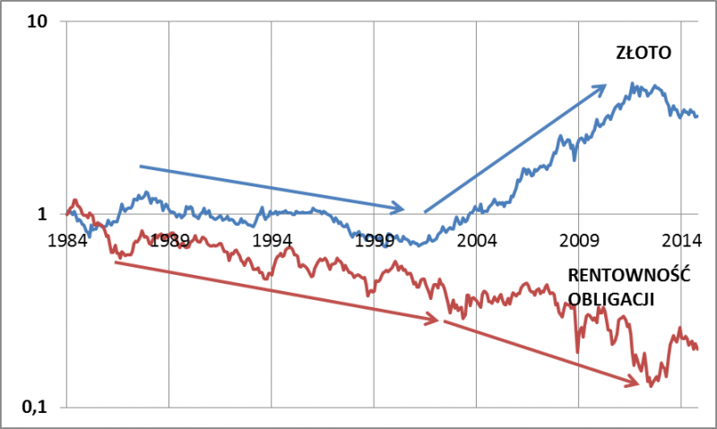 W komentarzach często podkreśla się zależność między rentownością obligacji (na tzw. rynkach bazowych, w tym głównie USA), a trendami na rynku cennego kruszcu. Zakłada się dość powszechnie, że spadająca rentowność (czyli rosnące ceny obligacji), wiąże się zwykle z hossą na rynku złota, zaś rosnąca rentowność powoduje bessę. Faktycznie, jeśli pod uwagę weźmiemy ostatnie kilkanaście lat, to ten mechanizm zdaje się działać bardzo sprawnie. Wielkiej złotej hossie trwającej do 2011 r. towarzyszył stopniowy spadek rentowności amerykańskich papierów skarbowych, zaś w 2013 r. silna korekta rentowności w górę wywołała pierwsze od lat duże tąpnięcie. Korelacja jest bezsprzeczna. Czasem tłumaczy się tę zależność na zasadzie alternatywy – im wyższa rentowność obligacji, czyli im wyższa ich atrakcyjność, tym relatywnie mniej atrakcyjne złoto (które w odróżnieniu od obligacji nie przynosi dochodów odsetkowych).