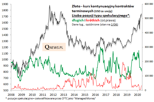 Tzw. długie pozycje (czyli pozwalające z tzw. dźwignią zarabiać na wzroście cen) zakwalifikowane jako spekulacyjne zmalały wg danych na 2 czerwca do poziomu najniższego od ... ponad roku. Od szczytowych rozmiarów z lutego pozycje typu long odchudziły się już o ponad połowę (!). Jednocześnie rosnąć zaczęły krótkie pozycje (pozwalające z dźwignią zarabiać na spadku).