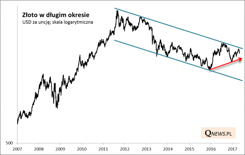 Czas odświeżyć diagnozę sytuacji na wykresach cen złota. Poprzednio (w marcu) pokazaliśmy, że od 2011 r. notowania szlachetnego metalu poruszają się w szerokim kanale spadkowym. Dopiero wybicie górą z tego kanału miało być sygnałem nadejścia trwałej hossy.