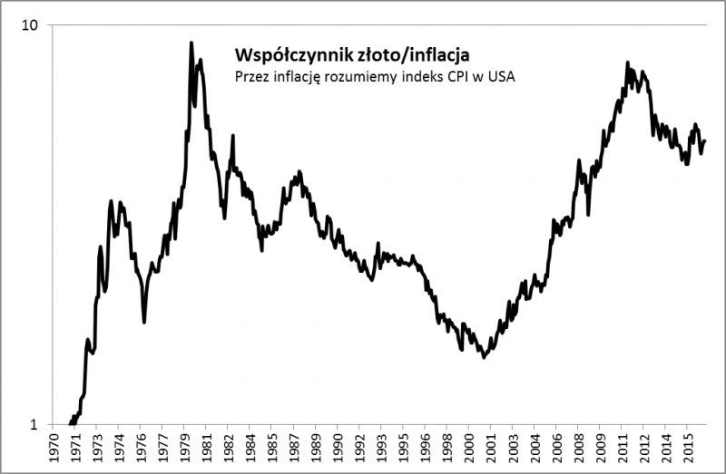Czy hossa na złocie byłaby możliwa z fundamentalnego punktu widzenia? Prawdopodobnie tak, choć według obserwowanego przez nas współczynnika złoto/inflacja (w końcu metal ten powszechnie uznawany jest za zabezpieczenie przed inflacją) kruszec nie jest tani. Ewentualna hossa prawdopodobnie musiałaby zaprowadzić wycenę złota w kierunku rekordowych poziomów z lata 2011 oraz początku lat 80.
