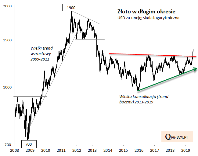 Przez kilka długich lat notowania szlachetnego metalu pozostawały w męczącym trendzie bocznym, kilkakrotnie pojawiały się nieudane próby wybicia górą, które mogły jeszcze bardziej zwiększać poziom frustracji inwestorów. Ale to się najwyraźniej właśnie zmieniło. Cena złota wreszcie wybiła się górą z trendu bocznego i jest najwyżej od ... sześciu lat.