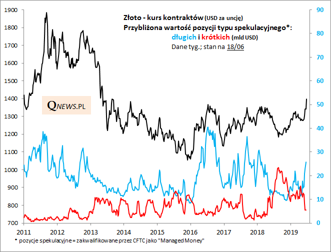 Niestety na to pytanie nie ma prostej odpowiedzi. Z pewnością obecny ruch został już powszechnie zauważony, o czym świadczy silny przyrost monitorowanych przez nas pozycji spekulacyjnych na rynku kontraktów terminowych w USA. Z drugiej strony tych pozycji nie ma jeszcze aż tak dużo jak np. w momencie kształtowania się lokalnej górki w połowie 2016 roku (tu zastrzeżenie - najnowsze dostępne dane dotyczą stanu na 18 czerwca). Nawet w trakcie potężnej hossy z lat 2009-2011 cena złota potrafiła się po drodze mocno korygować.