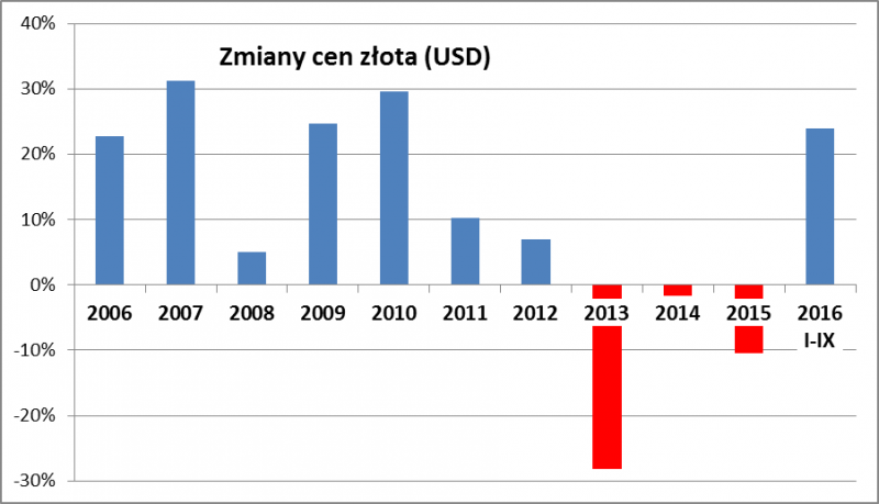 Mamy ciekawą sytuację na rynku złota. Z jednej strony, po 9. miesiącach cenny kruszec jest ciągle absolutnym liderem, jeśli chodzi o tegoroczne stopy zwrotu. Ogólnie w tym roku sprawdza się analizowana przez nas niegdyś reguła "kupuj ubiegłorocznych przegranych", bo w 2015 r. złoto należało do najgorszych inwestycji (przynajmniej w ujęciu dolarowym).