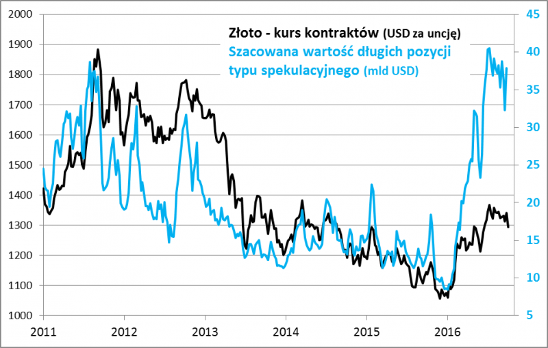 Z pewnością "do szczęścia" brakuje nadal wyraźnej redukcji długich pozycji typu spekulacyjnego na rynku kontraktów terminowych. Według najświeższych danych komisji CFTC liczba, jak i wartość tych pozycji są ciągle bliskie rekordów. A przecież cena złota wcale blisko rekordów z 2011 roku nie jest.