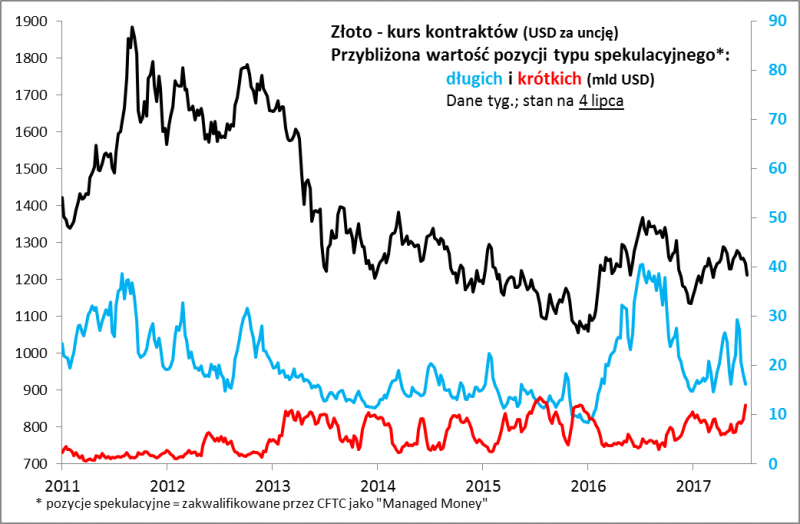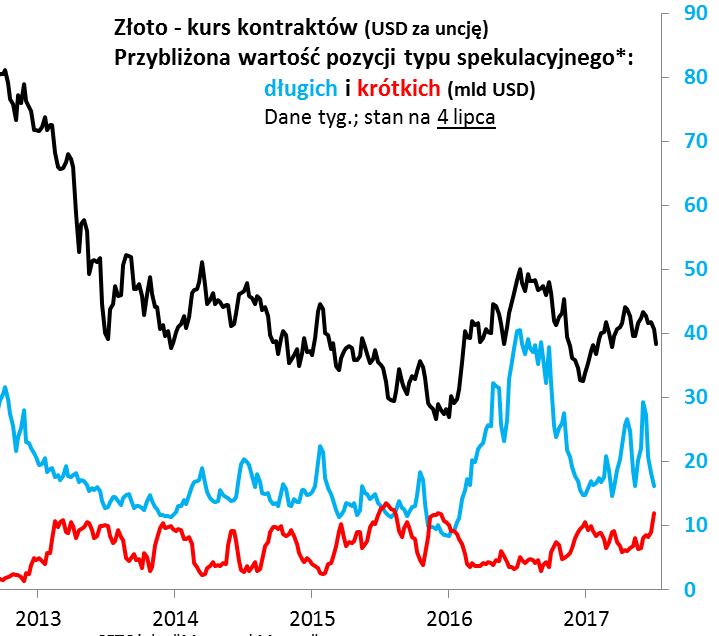 Teorie teoriami, a w praktyce sprawdza się też przyglądanie się poczynaniom dużych graczy na rynku złota (głównie funduszy hedgingowych). Nowość jest taka, że wyraźnie urosły krótkie pozycje spekulantów (czyli pozwalające obstawiać spadek notowań). Ich wartość to wg naszych szacunków (na podst. danych CFTC) prawie 12 mld USD. Większe były właściwie tylko raz - dwa lata temu, gdy złoto zbliżało się do "twardego dna". Ideałem byłby jeszcze wzrost wielkości tych pozycji powyżej wartości "longów" (pozycji długich pozwalających obstawiać wzrost). Takie kontrariańskie sygnały kupna pojawiły się w II poł. 2015. Kto wie czy do tego nie dojdzie ponownie (uwaga - dane CFTC są publikowane tylko raz na tydzień i nawet wtedy dotyczą stanu sprzed kilku dni).