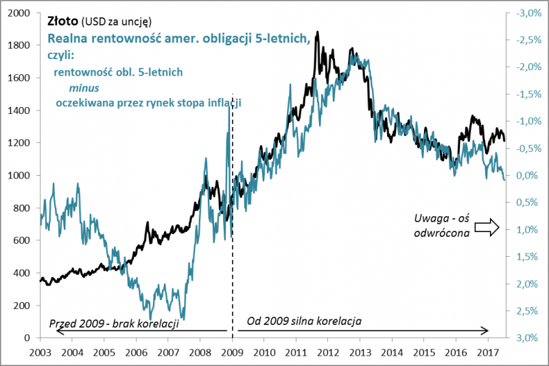 Co tak szkodzi szlachetnemu metalowi? Z poniższego z wykresu wynika, że mniej więcej od czasu kryzysu finansowego (2008) złoto bardzo nie lubi, gdy rośnie realna rentowność amerykańskich obligacji, a innymi słowy - gdy rentowność obligacji rośnie szybciej, niż oczekiwana inflacja. Tak właśnie jest teraz (rentowności rosną, bo Fed zaostrza politykę, a jednocześnie oczekiwania inflacyjne maleją, bo tanieje ropa). Niektórzy analitycy tłumaczą ten fenomen na zasadzie konkurencji - dzięki wyższej realnej rentowności papiery skarbowe stają się bardziej atrakcyjne względem złota, które też postrzegane jest jako zabezpieczenie przed inflacją. Obecnie z tej teorii nie płyną dobre informacje dla szlachetnego metalu, choć trzeba zastrzec, że dawniej teoria ta się w ogóle nie sprawdzała.