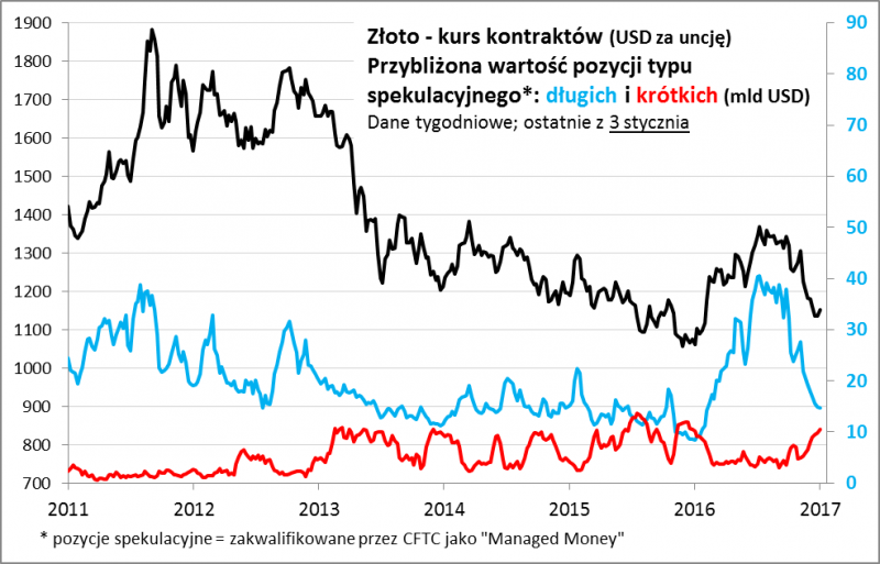 W tzw. międzyczasie sporo wydarzyło się, jeśli chodzi o monitorowane przez nas zaangażowanie kapitału spekulacyjnego. Dane komisji CFTC pokazują, że po histerycznych zakupach złota sprzed pół roku nie ma już śladu. Po drastycznym skurczeniu się długich pozycji spekulacyjnych (pozwalających obstawiać wzrost notowań) są one już niewiele większe od pozycji krótkich (pozwalających obstawiać spadek), które notabene ostatnio sporo urosły. Mówiąc prościej, optymizm traderów drastycznie zmalał, a pesymistów przybyło. Być może brakuje tu jeszcze przysłowiowej "kropki nad i" (pozycji spekulacyjnych krótkich więcej, niż długich), choć do sytuacji takiej doszło historycznie jedynie w okolicach dołka bessy w II poł. 2015 r.