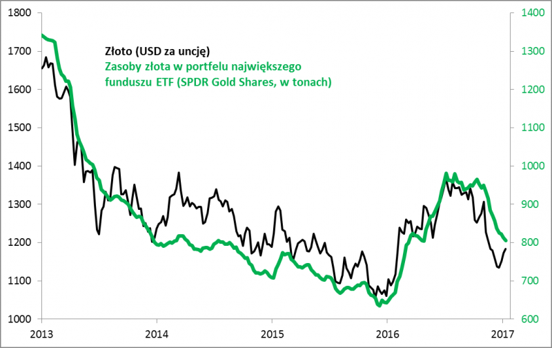 Choć dane na temat pozycji na rynku futures są opóźnione (ostatnie dostępne są datowane na 3 stycznia), to póki co wiary w trwałość zapoczątkowanej ostatnio zwyżki notowań nie widać również w świeższych informacjach nt. napływów do funduszy typu ETF. W największym z nich (SPDR Gold Shares) klienci niemal nieprzerwanie od lata ub.r. wycofują środki, co zmusza fundusz do redukcji zasobów kruszcu.