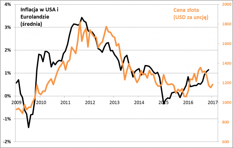 Jeśli chodzi o czynniki makro, to szans dla złota upatrywalibyśmy przede wszystkim we wzroście globalnej inflacji. Ewidentnie rynkowi szlachetnego metalu nie podobał się spadek inflacji (tzw. dezinflacja) w latach 2012-2014, jednak teraz trend zdaje się odwracać.