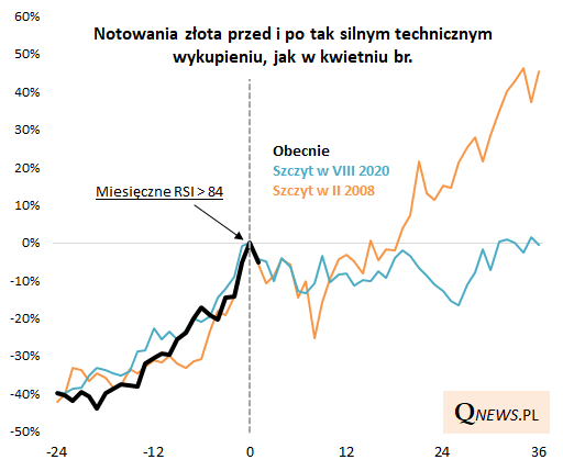 Naturalnym punktem wyjścia do analizy korekty rozgrywającej się w ostatnich tygodniach jest to, o czym pisaliśmy w końcówce kwietnia. Zwracaliśmy wtedy uwagę, że złoto kończyło poprzedni miesiąc w warunkach ekstremalnego technicznego wykupienia - oscylator RSI (liczony w oparciu o dane miesięczne) wspiął się aż do 85 pkt. Taka sytuacja na przestrzeni co najmniej 40 lat (!) miała miejsce tylko dwukrotnie - w sierpniu 2020 oraz w lutym 2008.