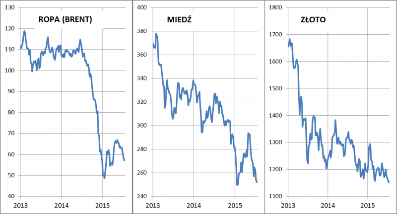 Od dwóch miesięcy obserwujemy powrót cen części kluczowych surowców w kierunku dołków trendu spadkowego. Chodzi tu zarówno np. o miedź (obawy o kondycję chińskiej gospodarki), jak i ropę naftową (porozumienie z Iranem, nadal duże zapasy). Do tego trendu w pewnym stopniu przyłączyło się też złoto, którego notowania zabrały się za testowanie tegorocznych minimów. Bessa na rynku cennego kruszcu trwa już prawie cztery lata, przy czym ostatnie dwa lata to raczej powolne osuwanie się notowań niż mocna zniżka na wzór tej z I poł. 2013 roku.