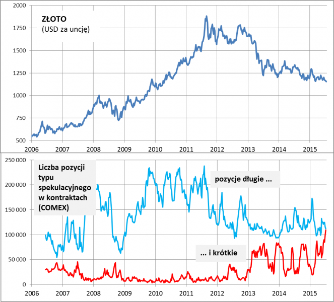 Jeśli już doszukiwać się argumentów na korzyść cennego kruszcu, to jednym z nich jest paradoksalnie coraz bardziej widoczna niechęć inwestorów. Zasoby złota w największym funduszu ETF (SPDR Gold Shares) są na poziomie najniższym od siedmiu lat. Z kolei fundusze hedgingowe coraz agresywniej obstawiają scenariusz dalszej przeceny surowca. Jak wynika z cotygodniowych raportów CFTC, liczba krótkich pozycji typu spekulacyjnego w kontraktach na złoto na giełdzie COMEX osiągnęła rozmiary niewidziane od lat (rekordowe?) i niemal zrównała się z liczbą długich pozycji – czegoś takiego jeszcze nie obserwowaliśmy w trakcie obecnej bessy na tym rynku. Wartość „shortów” osiągnęła prawie 12,6 mld USD.