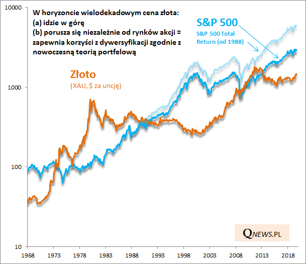 Przypomnijmy też ujęcie długoterminowe. W perspektywie wielodekadowej największą zaletą złota jest to, że cechuje się brakiem wyraźnej korelacji z akcjami. Według nowoczesnej teorii portfelowej to niebagatelna zaleta, bo połączenie w ramach portfela dwóch nieskorelowanych ze sobą aktywów pozwala uzyskać poziom ryzyka niższy niż ryzyko każdego z nich (to właśnie za to odkrycie H. Markovitz otrzymał nagrodę Nobla).