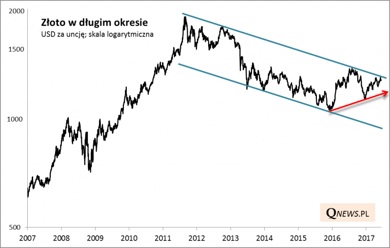 Czas na odświeżenie diagnozy na rynku złota. Notowania szlachetnego metalu podejmują kolejną próbę przebicia linii łączącej serię lokalnych szczytów. Ta techniczna bariera obejmuje okres o niebagatelnej długości 5,5 roku. Według książkowych schematów sforsowanie tej bariery powinno zatem mieć odpowiednio duże pozytywne konsekwencje.