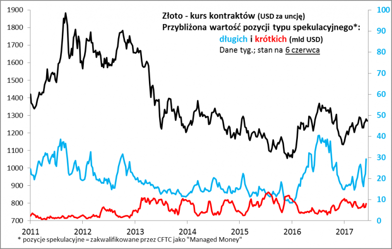 Po ostatnim wahnięciu w górę długie pozycje typu spekulacyjnego znalazły się wg naszych obliczeń na poziomie najwyższym od października ub.r. (czyli powróciły do poziomów sprzed wygranej Trumpa w wyborach). Oznacza to, że rynek złota zaczyna stopniowo zmierzać w kierunku przegrzania. Pocieszać się można, że do skrajnie niebezpiecznych pułapów takich jak w połowie 2016 lub w poł. 2011 jeszcze trochę brakuje - będziemy monitorować sytuację.