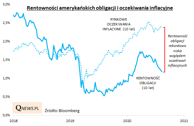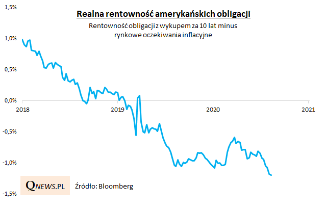 Różnica między rentownością obligacji, a oczekiwaną długoterminową inflacją, czyli realna oczekiwana rentowność obligacji, zawędrowała w efekcie do rekordowo ujemnego poziomu.