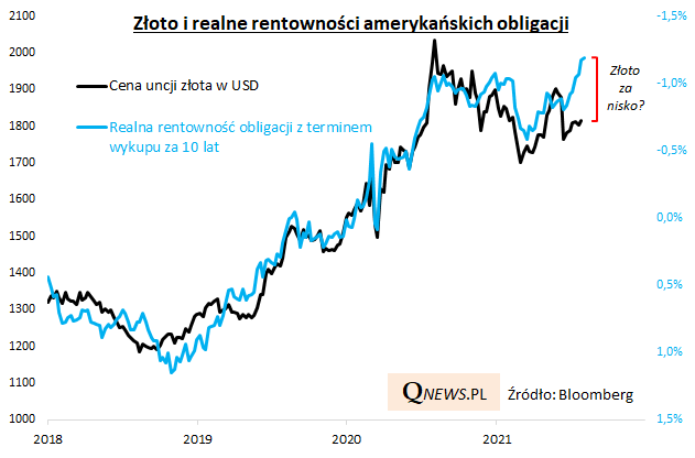 Reasumując, notowania złota "przespały" zejście realnej rentowności obligacji do rekordowo ujemnych poziomów. W efekcie wydaje się, że szlachetny metal jest niedowartościowany.