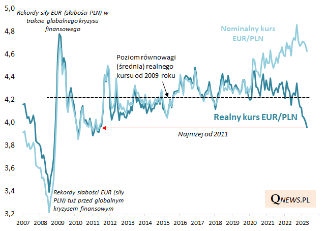 Rys. 3. Realny (skorygowany o relacje inflacji) kurs EUR jest najniższy od ponad dekady!