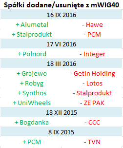 Zmiany te przypominają, że pod niezmienną nazwą danego indeksu kryje się nieustannie zmieniający się "mix" spółek. Przyjrzeliśmy się rewizjom składu mWIG40 z ostatnich dwunastu miesięcy. Okazuje się, że w tym czasie z indeksu odeszło aż 9 spółek, a ich miejsce zajęły inne. Oznacza to, że zmiany objęły ponad 1/5 całego składu (oczywiście nieco inaczej wyglądałoby to, biorąc pod uwagę wagi tych firm w koszyku). W jednym z przypadków pewna firma opuściła mWIG zaledwie rok po dodaniu do indeksu.