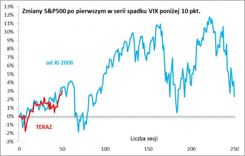 Pytanie – co to może oznaczać na przyszłość? Wbrew oczekiwaniom rynkowych niedźwiedzi – raczej nie rychłą bessę. Nawet we wspomnianym 2006 roku na bessę trzeba było poczekać jeszcze prawie rok. Ale o dość silną korektę może być już dużo łatwiej. Z naszej analizy wynika, że obecna ścieżka S&P500 najbardziej przypomina właśnie rok 2006, jeśli za punkt wyjścia wziąć maj br. (wtedy VIX po raz pierwszy osunął się poniżej 10 pkt.). Z tego porównania wynikałoby, że mniej więcej do połowy sierpnia akcje na Wall Street „powinny” jeszcze drożeć, po czym wg tej analogii miałoby dojść do głębszej korekty (jakieś 6 proc. od szczytu i 4 proc. od obecnego poziomu). Potrzebny byłby tylko jakiś dobry pretekst (może zbliżanie się wrześniowego posiedzenia Fedu, na którym ogłoszona może zostać redukcja bilansu?). Ta domniemana korekta byłaby jednak raczej okazją do kupowania, niż właściwą bessą.