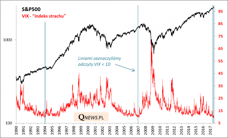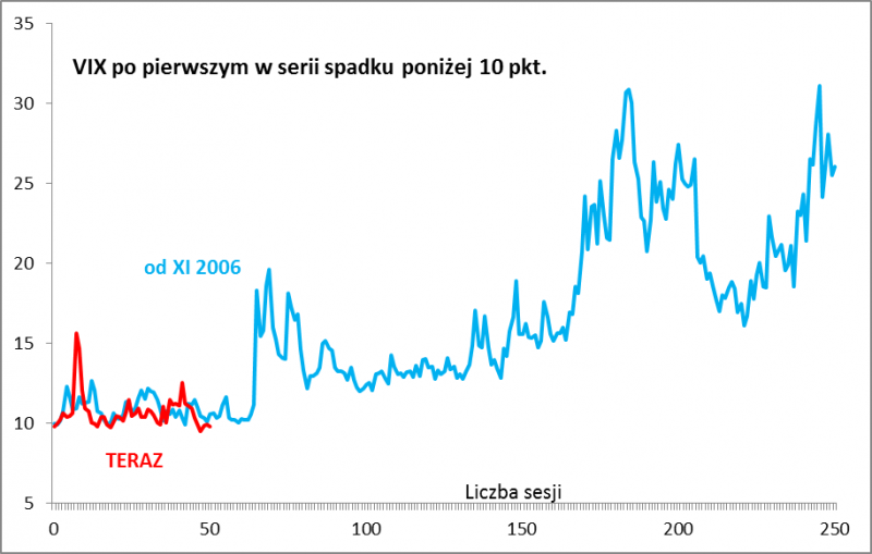Amerykański „indeks strachu” VIX od pięciu sesji tkwi poniżej ultra niskiego pułapu 10 pkt. Z naszych ustaleń wynika, żeto nowy historyczny rekord - wcześniej najdłuższa taka seria miała miejsce jeszcze w grudniu 1993 roku, czyli w czasach, które pamiętają tylko rynkowi weterani. Innym razem odczyty poniżej 10 pkt. zdarzały się w końcówce 2006 roku. Na Wall Street mamy jeden z najspokojniejszych historycznie okresów!