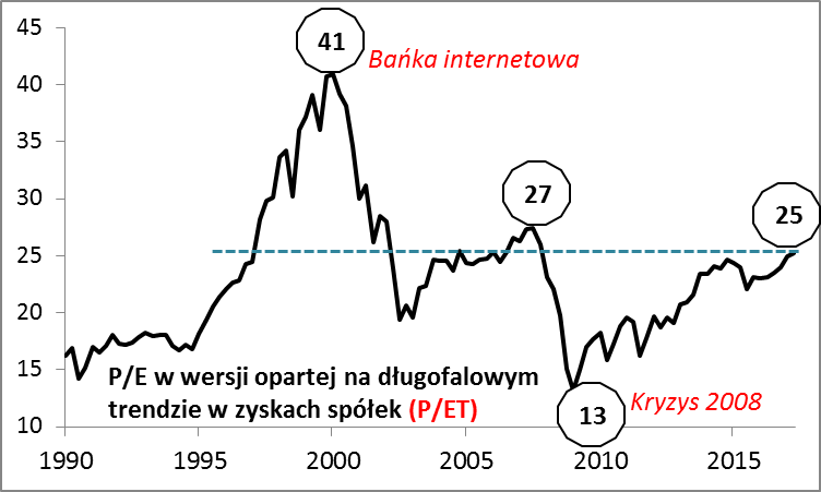 Wskaźnik P/ET pozostaje na dość wysokim poziomie, aczkolwiek ciągle nieco niżej, niż w 2007 roku oraz zdecydowanie poniżej rekordów z okresu bańki internetowej z przełomu wieków.