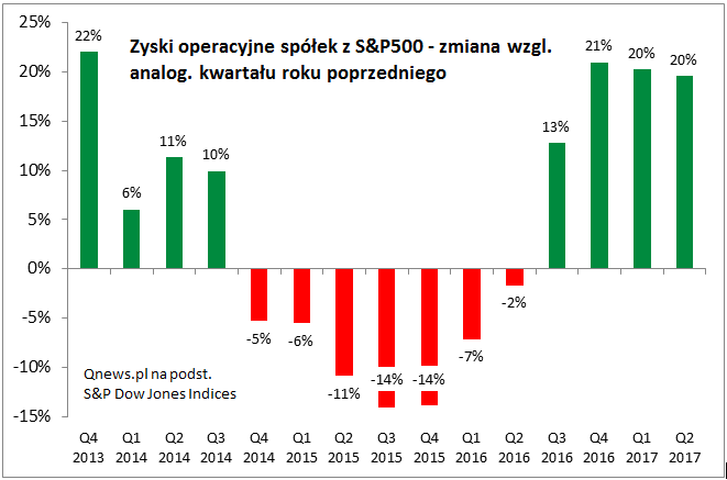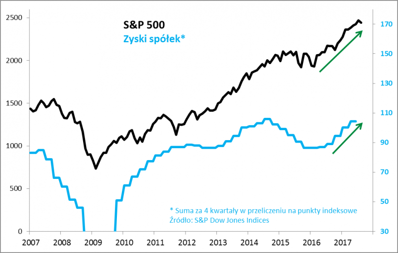 Zauważmy, że w okresie "recesji wynikowej" trwającej od poł. 2014 do przełomu 2015/2016 (wywołanej głównie przez sektor naftowy po załamaniu cen ropy) amerykański indeks zachowywał się słabo (do tego stopnia, że w którymś momencie powszechne były obawy przed bessą). Teraz mamy jednak pozytywny trend - zyski powracają do rekordowego pułapu z 2014. Jeśli już można na coś narzekać, to na fakt, że indeks S&P 500 tamten rekord pobił już ponad rok temu. Być może amerykańskie akcje zagalopowały się więc nieco w stosunku do zysków (korekta pod koniec roku nie byłaby więc czymś zaskakującym). Niemniej na dłuższą metę utrzymujący się trend w zyskach odczytujemy pozytywnie.