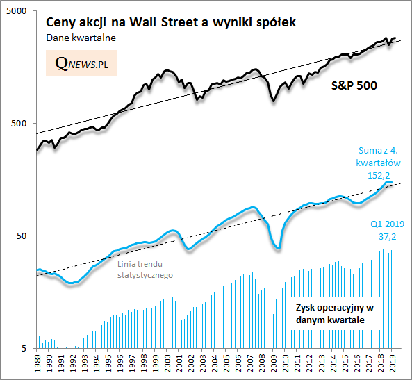 Nowe rekordy zysków, choć wypracowane z wyraźnym trudem, są nie przez przypadek skorelowane z nowymi rekordami S&P 500 (które indeks zdołał osiągnąć, zanim "zdołowały" go groźby prezydenta Trumpa w sprawie nowych ceł na Chiny). Na długą metę można założyć, że nie ma wzrostu S&P 500 bez równoległego wzrostu zysków korporacji.