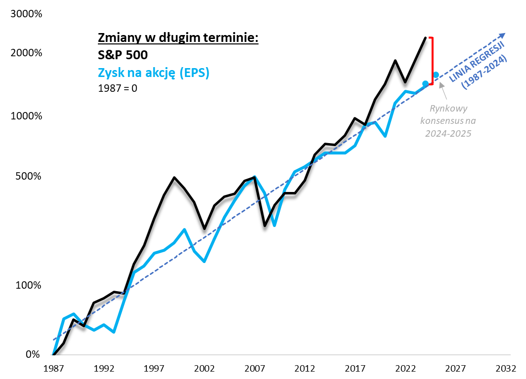 Z długoterminowego punktu widzenia o równowadze między akcjami i zyskami spółek można mówić, gdy S&P 500 jest w pobliżu nawet nie tyle EPS za dany rok (bo ten potrafi ulegać pewnym fluktuacjom), lecz przede wszystkim w pobliżu linii regresji. Ostatnio tak rozumiany stan równowagi został (prawie) osiągnięty po „mini bessie” w 2022 roku. Od tego jednak czasu obserwujemy znów sytuację, w której S&P 500 coraz bardziej odrywa się w górę od rosnącej w dużo bardziej stonowanym tempie linii regresji. Po euforycznej reakcji Wall Street na wynik wyborów główny amerykański indeks znalazł się w punkcie, który linia regresji EPS osiągnęłaby dopiero w okolicy … 2032 roku.