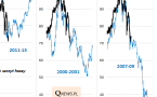 Warszawski Indeks Giełdowy spada dużo szybciej niż wynikałoby z uśrednionego historycznego wzorca, a zarazem uparcie podąża ścieżką z lat 2007-2008. Nawet to negatywne skojarzenie przynajmniej przejściowo daje jednak szansę na krótkoterminowe odreagowanie notowań akcji.