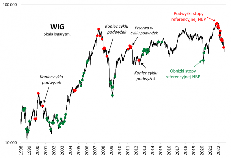 Nasza pierwsza szersza analiza na temat wpływu znaczenia zacieśniania monetarnego dla krajowego rynku akcji – dokładnie sprzed roku – była zatytułowana „Jedna podwyżka stóp hossy (jeszcze) nie wykolei”. Wniosek wtedy był taki, że pierwsze w cyklu podniesienie kosztu pieniądza tylko czasem wiązało się z końcem hossy na GPW. Ale wraz z upływem czasu, gdy RPP dostarczała kolejne podwyżki stóp, z naszych analiz zaczynał płynąć coraz bardziej jednoznaczny i negatywny obraz, poparty historycznymi zależnościami (po trzeciej-czwartej podwyżce historyczne prawdopodobieństwo było wynosiło już 100 proc.).