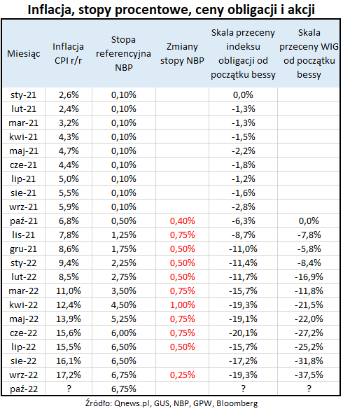 Co dalej? Dobra wiadomość jest taka, że po roku cykl zaostrzania polityki monetarnej wydaje się mocno zaawansowany. Niczego nie da się definitywnie przesądzić, bo w grę wchodzą zarówno trudno przewidywalne czynniki inflacjogenne (kryzys energetyczny), jak i wahania kursu PLN (im słabszy złoty, tym wyższa inflacja), ale załóżmy hipotetycznie na potrzeby dalszych rozważań, że koniec cyklu jest już w zasięgu ręki, a może nawet jest już za nami (z ostatnią jak na razie, i zarazem najmniejszą, podwyżką mieliśmy do czynienia we wrześniu). Jakie są implikacje dla rynków akcji i obligacji?
